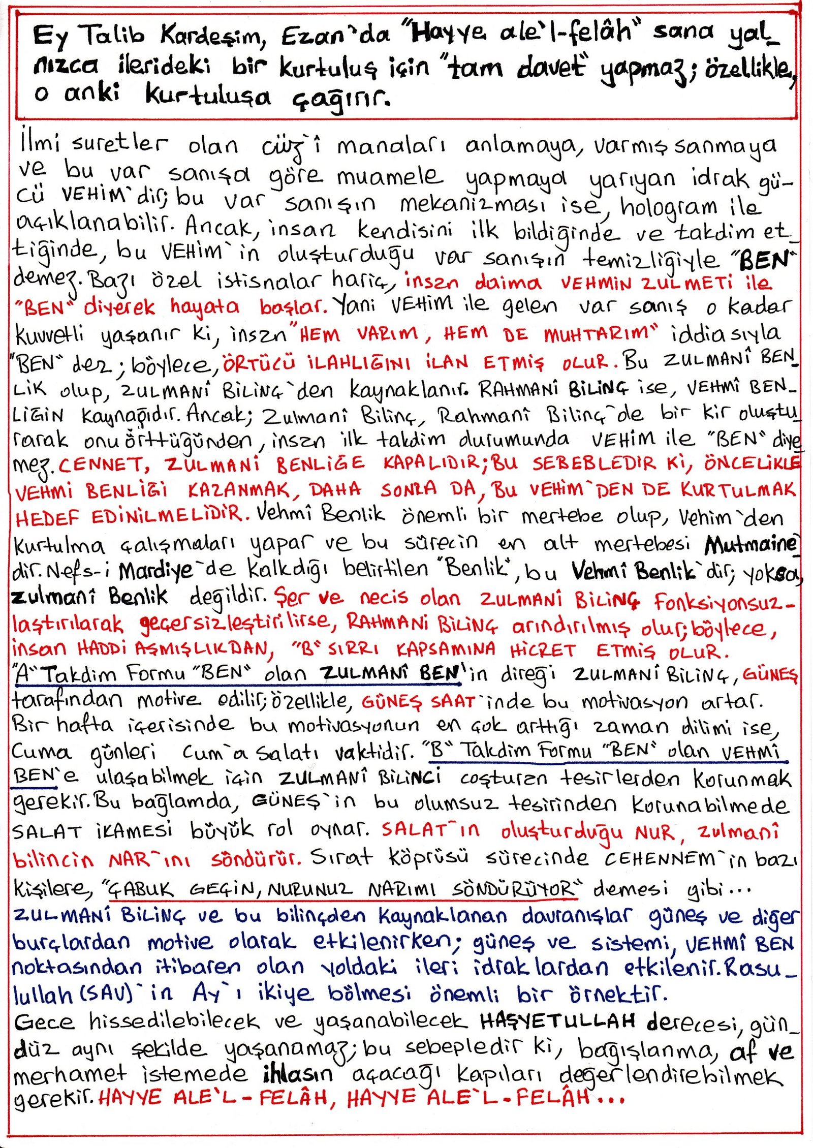 . Hayye Ale’l Felah!Talibe mektup: Ey Talip Kardeşim, Ezan’da “Hayye ale’l-felâh” sana yalnızca ilerideki bir kurtuluş için “tam…haf-adm23 Ocak 2020